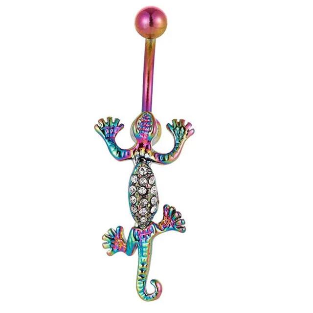 虹色にレインボーコーティングした動く14ゲージのトカゲの臍ピアス型ボディピアス。首の部分と体の部分が別々に動くのが面白い蜥蜴のヘソピアス型ボディーピアス。