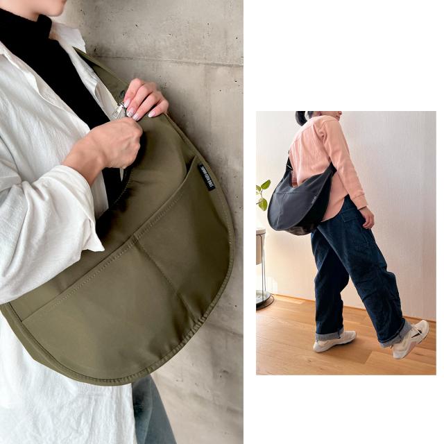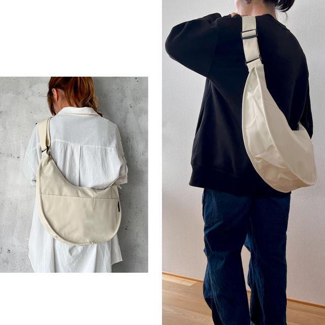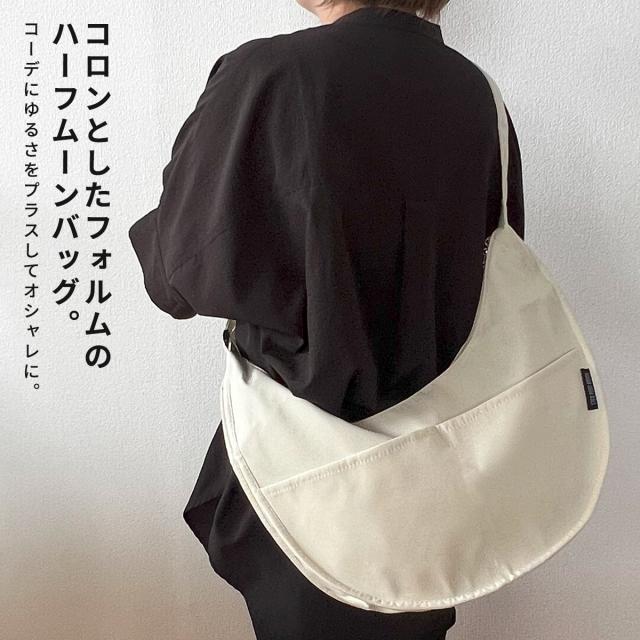 おしゃれで可愛い、ころんとしたフォルムのハーフムーンバッグ。コーデにゆるさをプラス。
