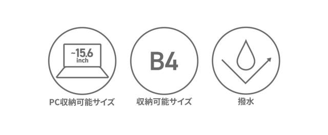 | 仕様 | <外側> ジップポケット(L)×1 └ 内蔵 ポケット(M)×1 ポケット(S)×1 ペンホルダー×3 ポケット(S)×2 メッシュジップポケット(M)×1 <内側> PC収納×1 |