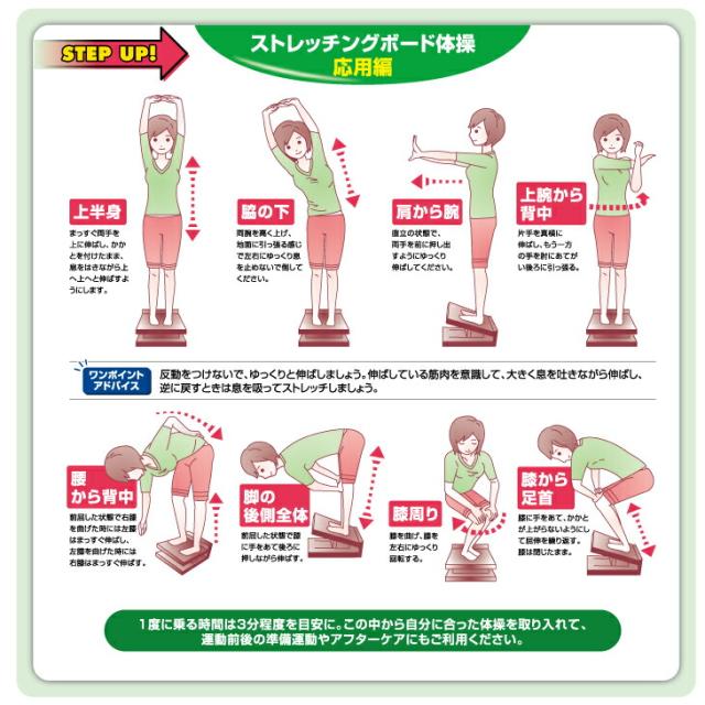 | 商品説明 | ● 場所を取らない。時間も要らない。・・・朝晩90秒乗るだけでOKだから、忙しい方でも大丈夫。コンパクト設計で場所も取りません。 ● “ついで”にできるから、続けられる!・・・TVを見ながら。歯を磨きながら。電話をかけながらetc.何かしながら、ついでにできる。 ● 体の硬さに合わせて自由に角度が変えられるので、 自分に合ったストレッチが可能です。 5度から35度までの角度設定(14段階)が可能。 ● つま先アップサポーター つま先を下から押し上げて、足底筋膜のストレッチもサポートする「つま先アップサポーター」を採用。 前屈運動により頭の先からつま先まで筋膜をストレッチできます。 ● 安全設計・・・特殊構造で、体重150kgの人まで大丈夫。 |