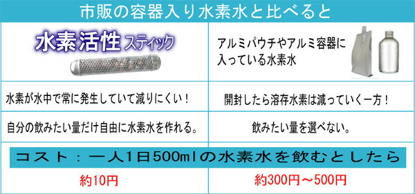 | 「ゼオライト入り・水素活性スティック」は、約6ヶ月間使用できます。 1日のコストを換算すると、1本3,780円÷183日=20.6円 毎日20円で1リットルのおいしくて安全な水素水を作ることができます。 |
