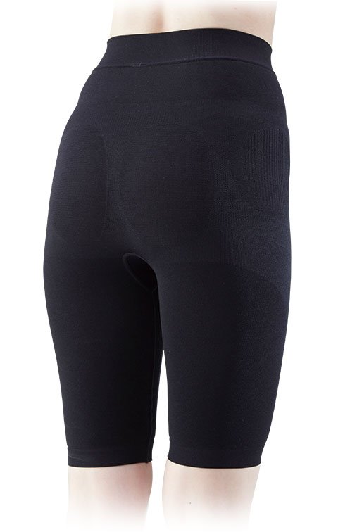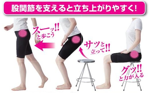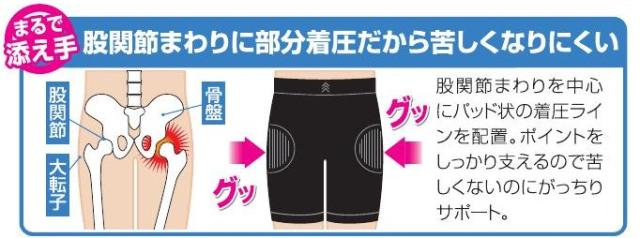 | リハビリ施設と共同開発した股関節スパッツ。 パッド状着圧ラインがまるで添え手のように股関節をサポート。 歩行も立ち上がりも楽に股関節まわりにパッド状の着圧ラインを配置したスパッツポイントをしっかりと支えるのでグッと力が入り、着用中の苦しさも感じにくい。 |