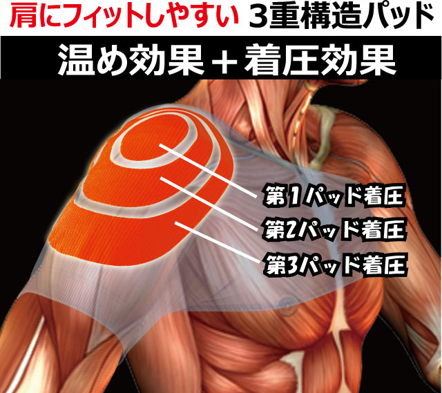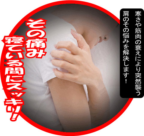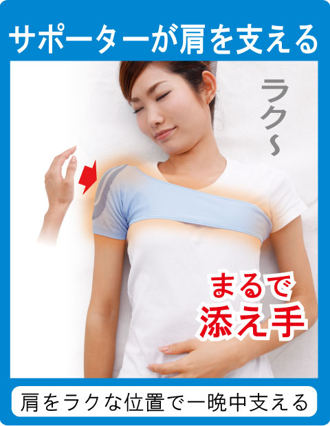 | サポーター着用による温め効果と着圧効果で寝ている間つらい肩をぐっと支える。 心地よく寝れる。寒さや筋肉の衰えにより突然襲う肩の悩み。一旦つらくなると、夜中続き、寝ることができない事も。 寝ながら肩サポーターはパッド状着圧ラインがピタッとフィットする事で、着用中はまるで添え手のように肩を温め、外側から内側へ押すように肩を支えることで、安定させるのでつらい夜も和らぎます。 |