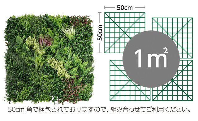 | 注意事項 50cm角で梱包されておりますので、組み合わせてご利用ください。 この商品は装飾用です。 本来の用途以外でのご使用はしないでください。 製品ロットにより色合いが異なる場合がございます。 経年劣化により色が変わる可能性がございます。 ●製品の近くで火気を使用しないでください。 ◆梱包で葉が潰れてしまっている場合があります。 開封してから葉を広げたりほぐし たりして調整してからご利用ください。 |