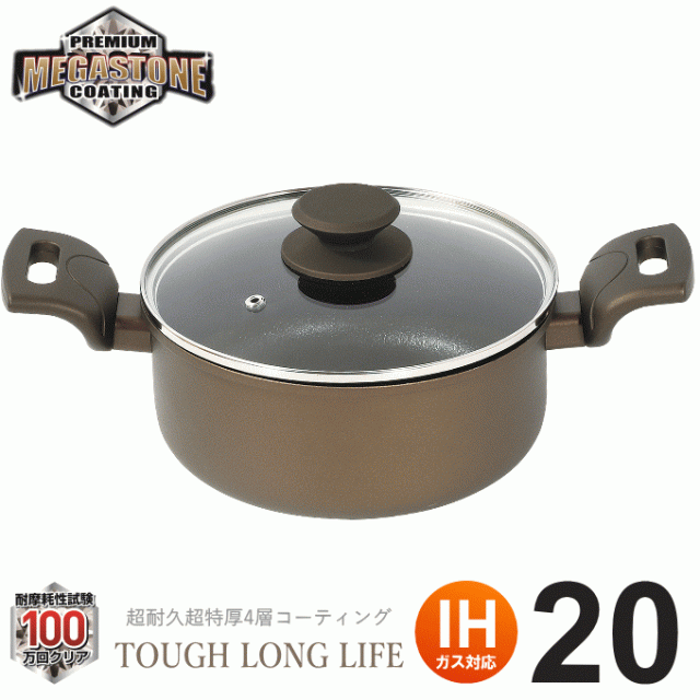 IH対応 ロングライフメガストーン蓋付両手鍋 20cm