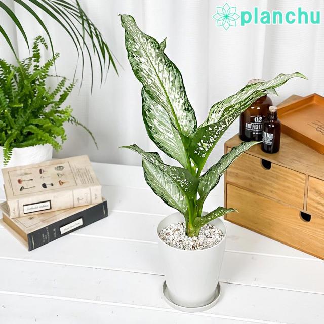 PLANCHU 観葉植物 ディフェンバキア ティキ 4号鉢 受け皿付き 育て方説明書付き Dieffenbachia ‘Tiki’ アロイド