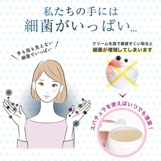 【いつでも清潔、衛生的】 私たちの手には目に見えない細菌がいっぱいです。クリームを指で直接すくい取ると、細菌が繁殖する原因になり衛生的によくありません。スパチュラを使用することを日常的に意識すれば、手や化粧品を汚さず清潔に使用することができます。このスパチュラは、プラスチックに20%の銅粉を均一分散させることで、銅の性能をプラスチックに含有しています。