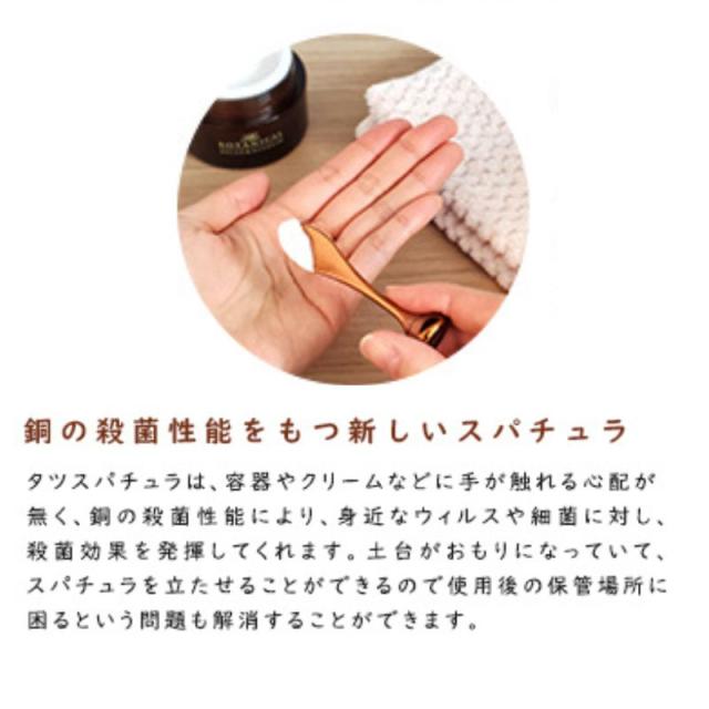 【水洗い対応】 グロスやクリームチークなど、スキンケア用品以外にもお使いいただけます。お気に入りの化粧品をいつでも清潔に使用するためにはスパチュラが欠かせません。プラスチックに銅粉20%を練り込んだ素材により、洗って繰り返し使用することが可能です。