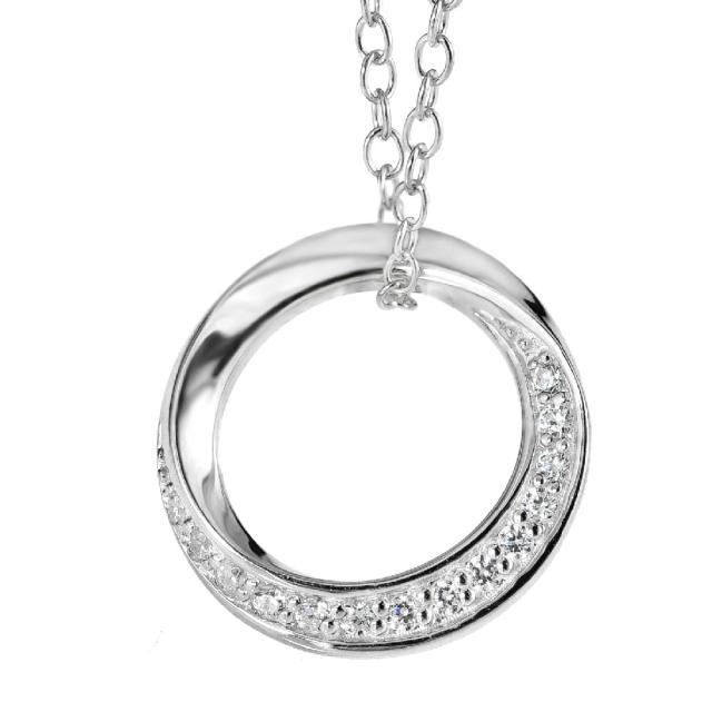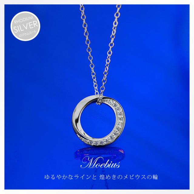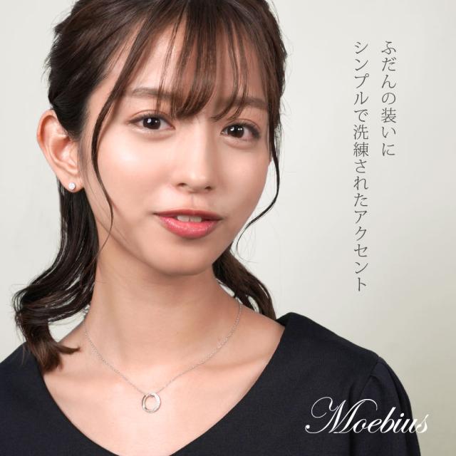 永遠を表すメビウスの輪をモチーフにしたリング状のデザインネックレス。ねじれた輪に沿って14粒のスワロフスキージルコニアをセッティングしているので、キラキラと胸元を華やかに演出します。ゆるやかなラインの洗練された輪っかデザインのシンプルで使いやすいデザインで、TPOを選ばず使えるネックレスです。大切な人への贈り物にもおすすめです。