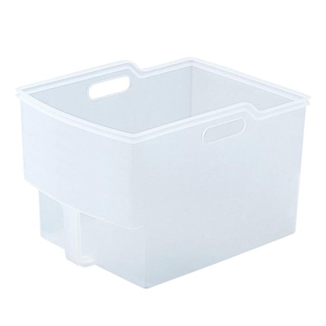 ●吊り戸棚などの高い場所での収納をもっと便利に簡単収納 ●ハンドル付きで、出し入れがラクにできる ●後部の傾斜で狭い棚でも引き出しやすい ●側面には、両手で持てる取っ手穴付き