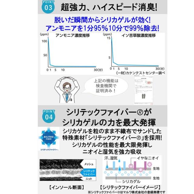 ・吸湿:靴内湿度30%ダウン:ムレを防止・ニオイ菌の繁殖を抑え、足臭未然防止・水虫菌(白癬菌)の繁殖を抑える。