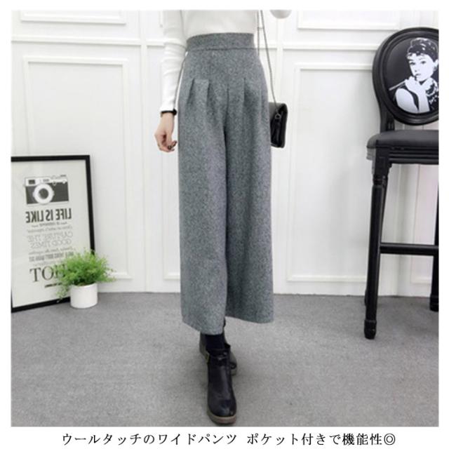 | 季節感とキチンと感のある ウールタッチのワイドパンツ ポケット付きで機能性◎ ウエストゴムでラクラク、ノンストレス 柔らかく暖かな素材で秋冬に大活躍 程よい丈感で美脚効果◎ 足首が見えるアンクル丈。 スッキリとした印象に。 ふんわりとしたデザインで体型カバー力◎ | |