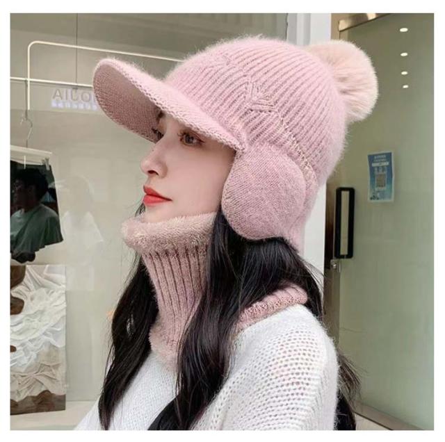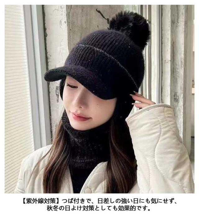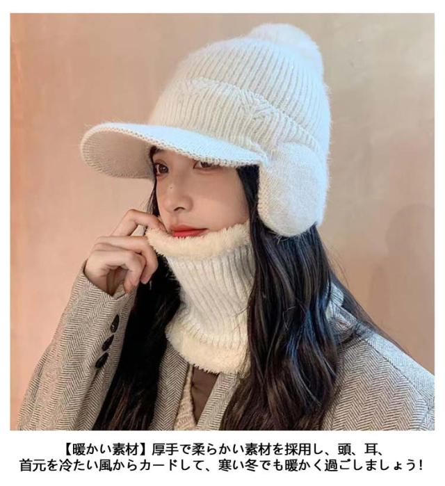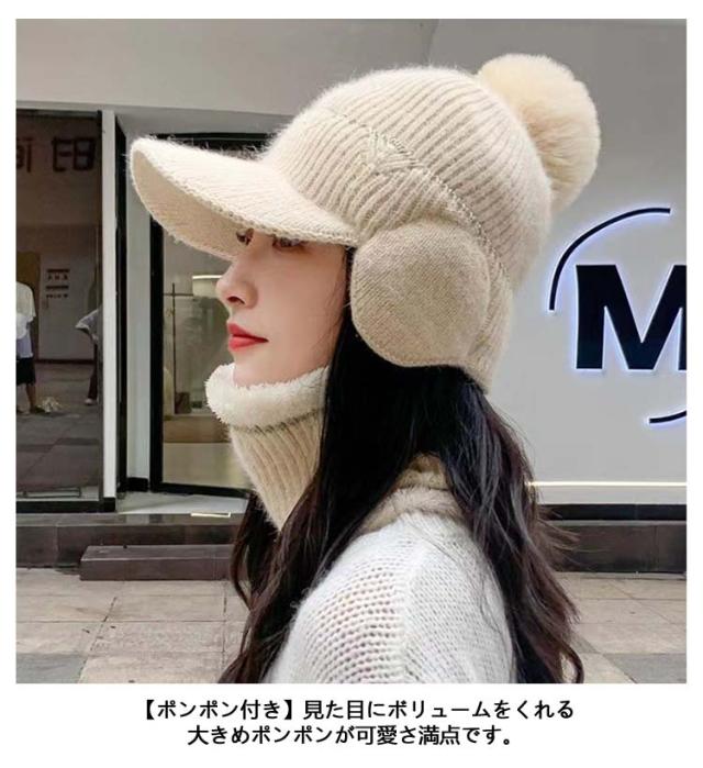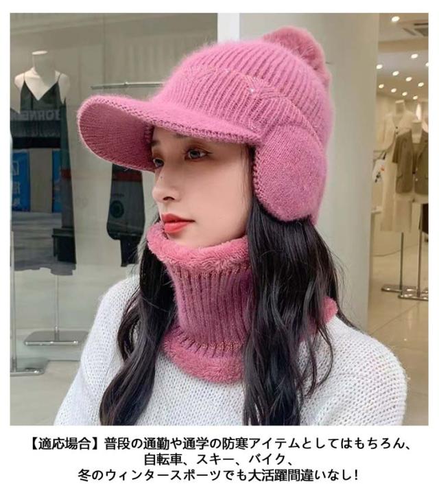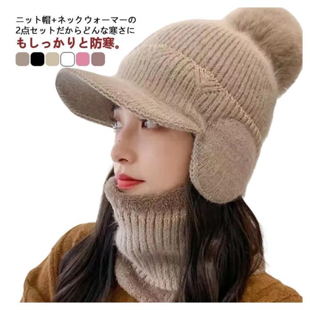 つば付き ネックウォーマー 2点セット レディース 秋冬 暖かい 裏起毛 帽子 ニット帽 可愛い 防寒 耳あて付き ポンポン付き おしゃれ 秋冬 リブ編み 保温 可愛い ニットキャップ ニット帽 自転車 アウトドア スキー シンプル