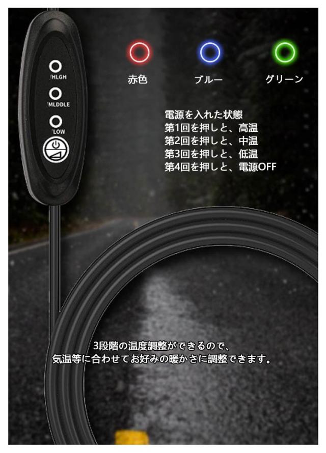 | 【グリップヒーター】【完全防水】【約10秒で急速加熱】 手先の冷えを解消してくれるバイクハンドル用ホットグリップです。 3段階の温度調整ができるので、気温等に合わせてお好みの暖かさに調整できます。スイッチ付きで手元でのオンオフ切り替え可能! 超大発熱フィルムを採用しており、10秒間に温度の上昇を感じさせ、耐劣化性、耐熱性に優れます。 オートバイや原付バイクなどのUSBポートからの給電をはじめ、対応からの給電にも対応し、自転車のハンドルにも取付可能。 メモリー機能が搭載されていて、電源を入れた状態でグリップヒーターの電源を切って、再び電源を入れると、自動的に最初に設定した温度に切り替えます。 マジックテープで脱着でき、使用しない時や外して洗ったりなどとっても便利! 防水質材を使用し、大雨でも安心!また汚れた時は水洗いも可能。 | |