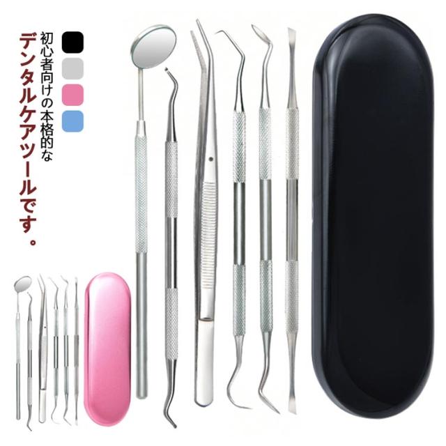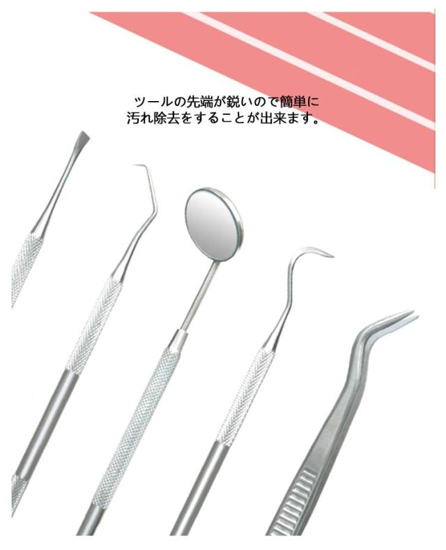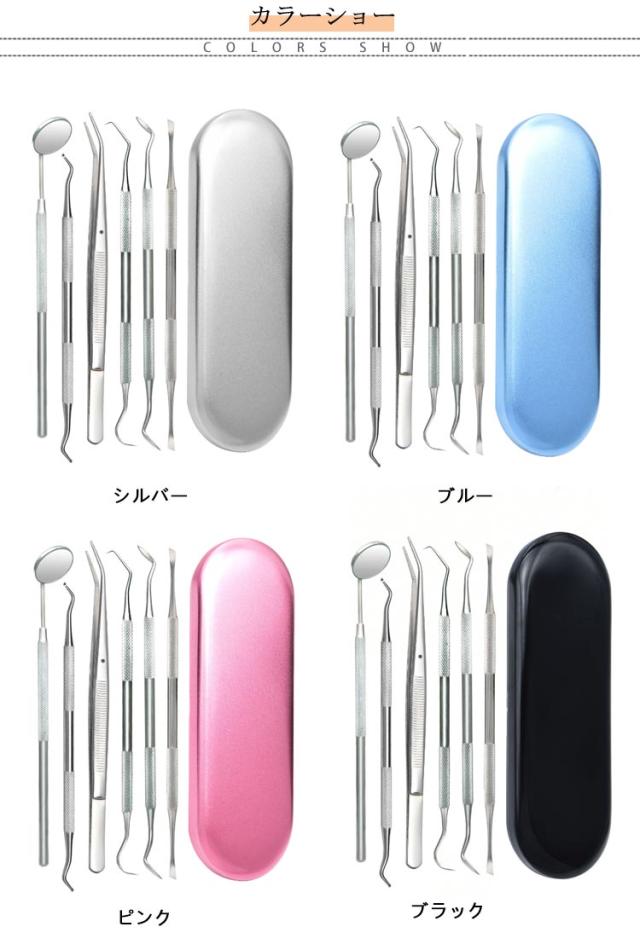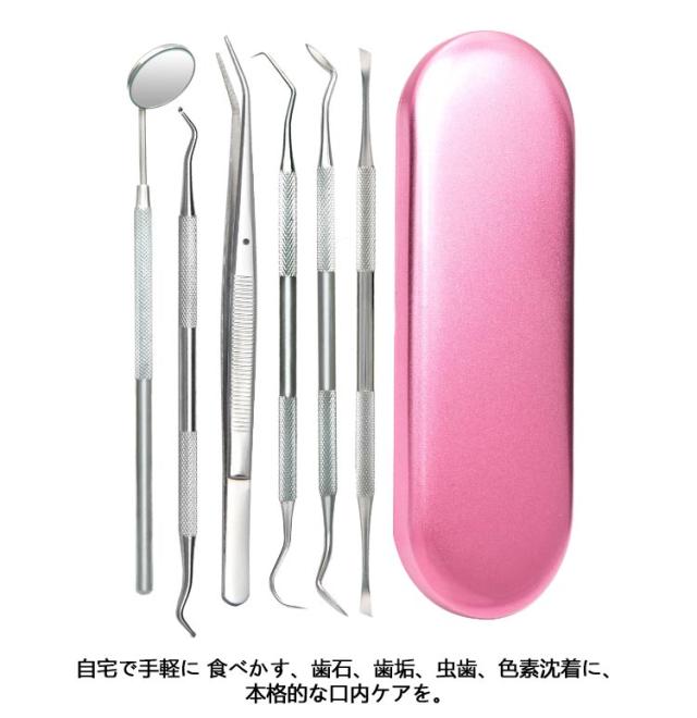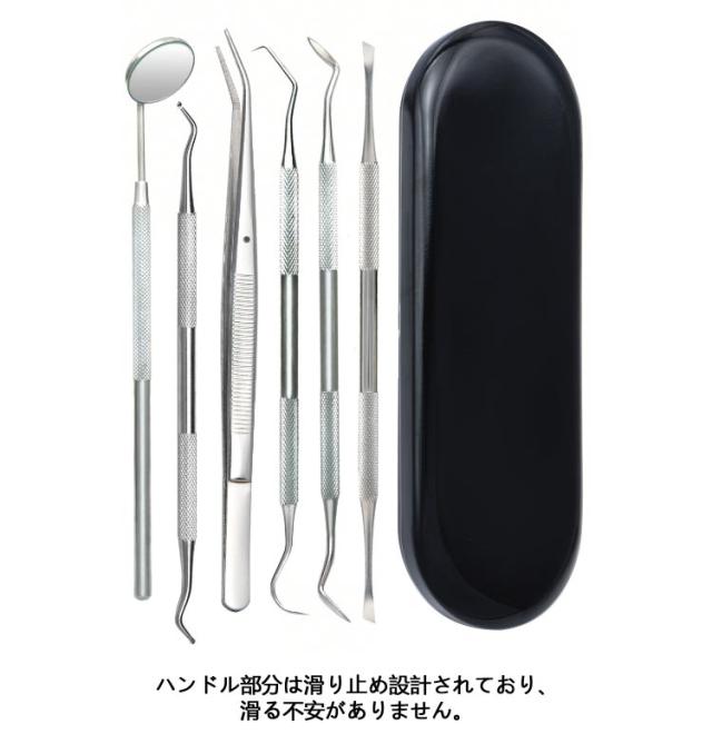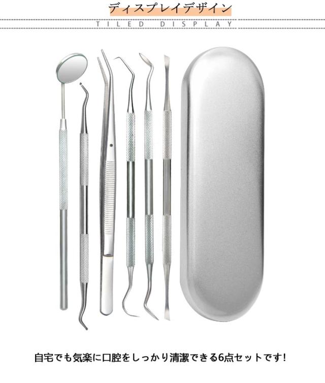 | 初心者向けの本格的なデンタルケアツールです。 自宅でも気楽に口腔をしっかり清潔できる6点セットです! ステンレス製を採用しており、耐摩耗、耐腐食に優れています。 自宅で手軽に 食べかす、歯石、歯垢、虫歯、色素沈着に、本格的な口内ケアを。 ツールの先端が鋭いので簡単に汚れ除去をすることが出来ます。 ハンドル部分は滑り止め設計されており、滑る不安がありません。 専用ケース付き、保管や持ち運びが簡単で、出張、旅行に適しています。 | |