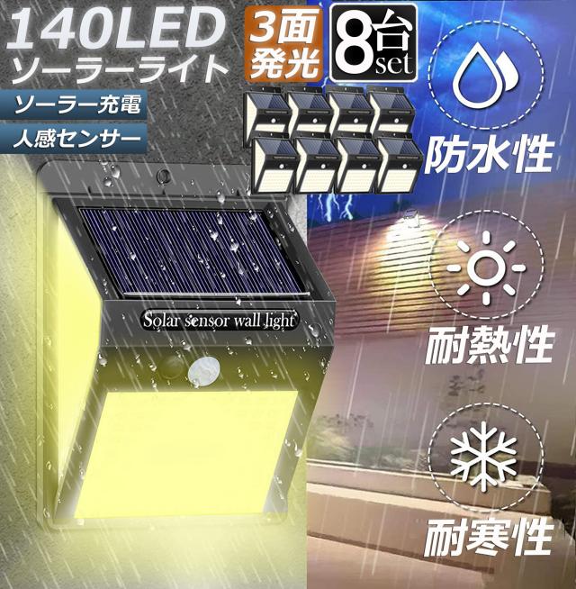 ソーラーライト 8個セット センサーライト 3面発光 140LED 300°照明 屋外 人感センサー 屋外照明 三つ知能モード 玄関ライト 自動点灯 太陽光発電 LEDライト 電球色 自動点灯 防塵 防水 防犯ライト 屋外 庭 玄関 ガーデ