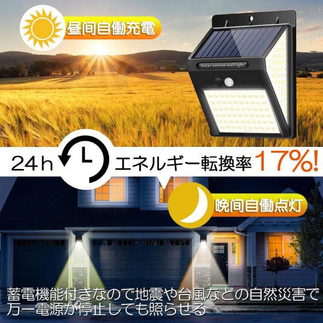 【省エネ・電気代不要・停電対応】人感ソーラーライトが先進のソーラーパネルが搭載され、昼間に太陽光に当たり、受けた太陽エネルギーを電気に変換して内蔵18650充電池に蓄積します。(太陽光発電の為17%高エネルギー転換率)、電気代がフリー、二酸化炭素がない、環境にも優しいし。蓄電機能付きなので、地震や台風などの自然災害で万一電源が停止しても照明機能を保ち、防犯や避難などに適用。停電対策としては完璧です。(ご注意:照明効果を確保するために、必ず遮るもののなく、昼間長時間直射日光に当たる場所に設置してください。)