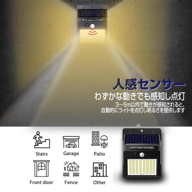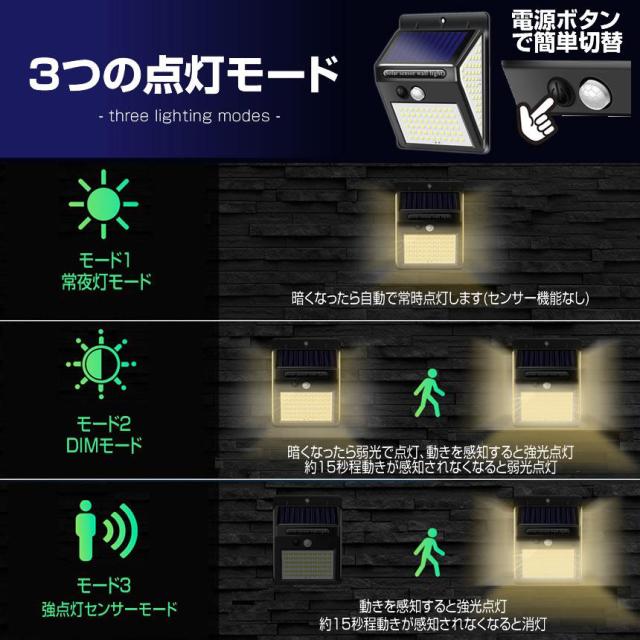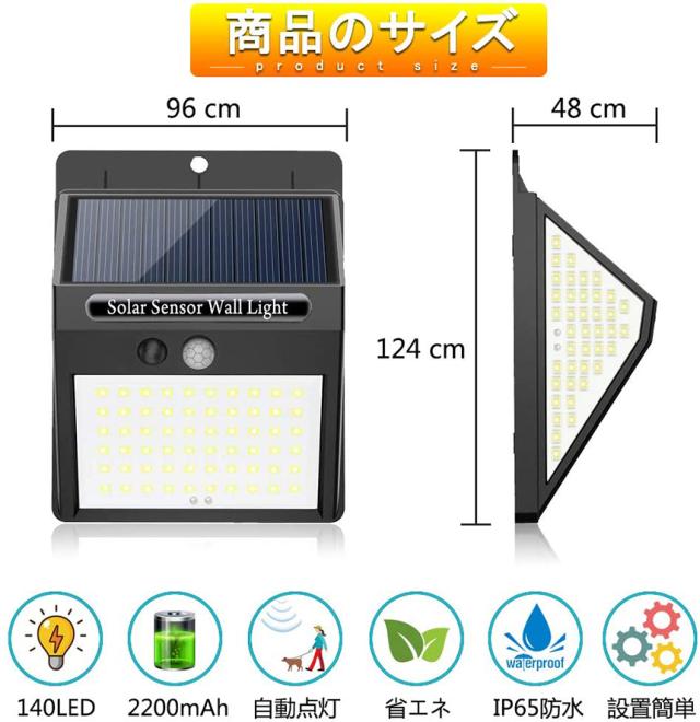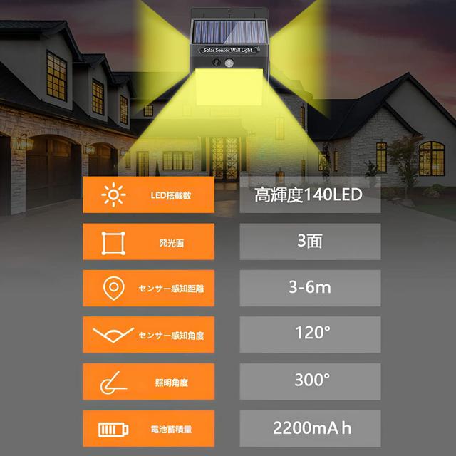 【最新版高輝度140LED・3面発光】140 LEDライトを搭載しているLEDソーラー式センサーライトをご提供致します。3面発光、以前よりも大きい側面ので、照射範囲が300°達成しました。バッチリの照明効果で、玄関、庭、パーク、ガーデン、縁側、屋外駐車場など場合に大活躍!【三つ知能モード・2200mAh大容量】本製品は三つ知能モード搭載され、常時点灯モード、DIMモード、センサモード3つの知能モードが搭載されます。玄関ライトや屋外防犯ライトとしてのセンサモードを勧めます。動きがないとき、点灯しない、動きを感知されると、点灯して、15-20秒のあと、自動消灯します、できるだけエネルギーを節約し、2200mAh容量を内蔵されるし、連続照明長時間可能です。(ご注意:十分な光があると、日中または夜間にソーラーライトが点灯しません。)