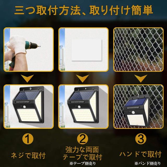 【IP65防水防塵・配線不要・設置簡単】コンパクトデザインで、どこに取付け・収納も便利です。IP65防水防塵規格で、雨がよく降られる場所に取り付けても壊す易い心配ない。また、ソーラー式なので、邪魔な配線は不要、設置易いなります。設置場合により、ネジ、テープとバンド(別売り)3つ取付方法があり、お宅の玄関・軒先・庭・駐車場・ガレージなどや事務所・店舗・倉庫・工場などの出入り口の様な人の通り掛かる場所には最適です。(ご注意:付属の両面テープは防水テープではないので、雨の多い場所に設置する場合でのテープ取付はお勧めしない。)