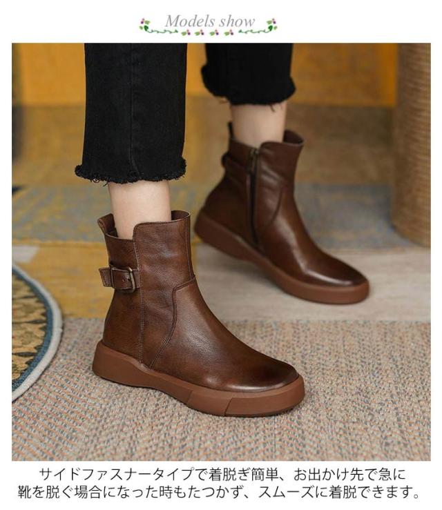 | カジュアルなのにおしゃれなショートブーツ。 サイドファスナータイプで着脱ぎ簡単、お出かけ先で急に靴を脱ぐ場合になった時もたつかず、スムーズに着脱できます。 凹凸のあるゴム底でしっかりと滑り止め雨の日も安心して歩きいただきます。 | |