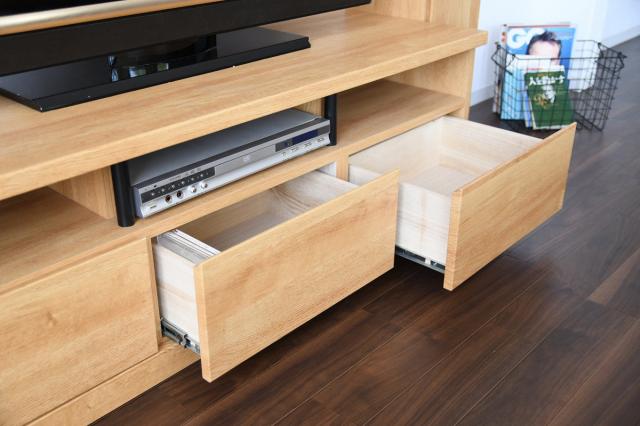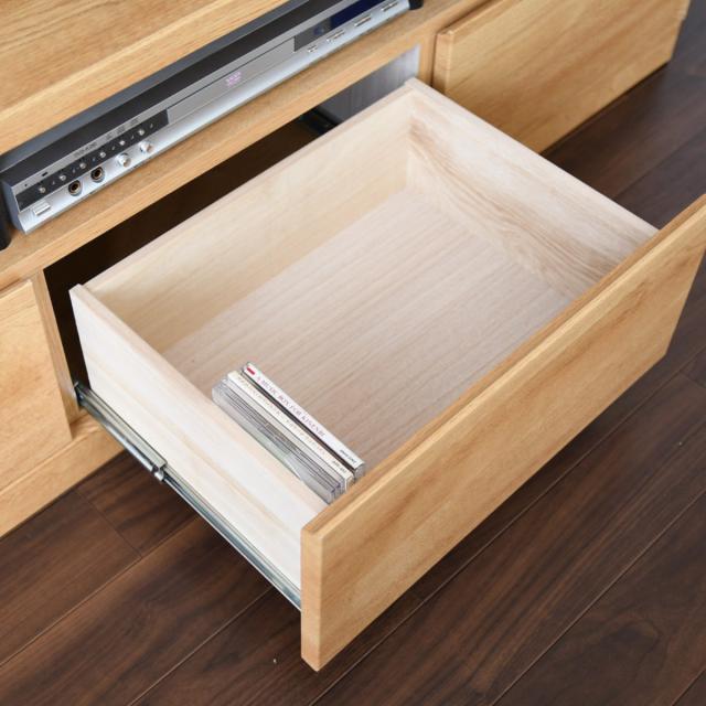 引出しはフルスライドレール仕様なので、奥の物まで見渡せて出し入れが楽ちんです。ディスクや小物をたくさん収納できるので、散らかりがちなテレビ周りをスッキリと片付けることができます。