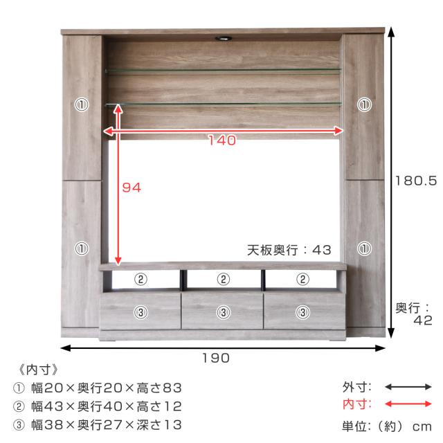 | サイズ | 約 幅190×奥行42×高さ180.5(cm) テレビスペース:約 幅140×奥行42×高さ94(cm) |