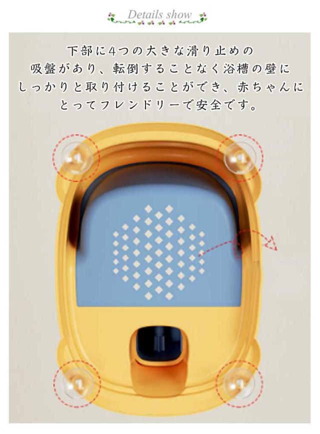 | 水が溜まらない設計なので、お風呂でも気楽に使用が可能です。 人体工学設計、赤ちゃんの背中の曲線に快適にフィットする。 体になじむ柔らかい素材を使用。赤ちゃんの皮膚を傷つける心配がありません。 下部に4つの大きな滑り止めの吸盤があり、転倒することなく浴槽の壁にしっかりと取り付けることができ、赤ちゃんにとってフレンドリーで安全です。 | |