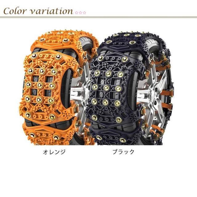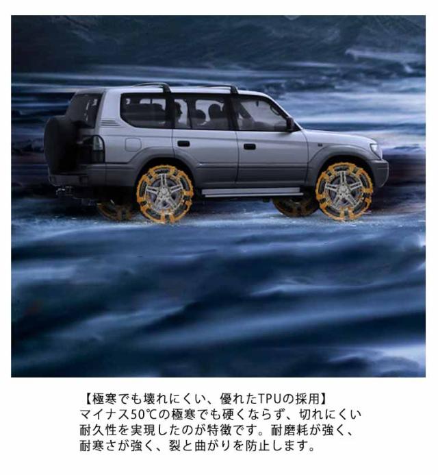 | 突然の雪や路面凍結に取付カンタンな非金属タイヤチェーン6個セット。 【極寒でも壊れにくい、優れたTPUの採用】マイナス50℃の極寒でも硬くならず、切れにくい耐久性を実現したのが特徴です。耐磨耗が強く、耐寒さが強く、裂と曲がりを防止します。優れたTPU素材は長持ちで耐久性があり、圧力・低温に優れています。従来の金属製とは違い、タイヤへの傷を付けにくく、低騒音、振動吸収性にも優れているので静かで快適な乗り心地を実現。長時間走行に適した耐磨耗性も備えています。 【ジャッキアップ不要で装着簡単】 分割式で従来品より簡単にタイヤに装着可能、煩わしいジャッキアップの必要がありません。取り付けに必要な道具もセットなので、急な降雪でも素早く取り付けができます。女性でも簡単に取り付け・取り外しが行えます。車内で場所を取らないサイズなので、突然の悪天候や路面の凍結などの緊急時にも手軽に持ち運べて、サッと取り出してすぐさま装着が可能です。いざという時にあると安心な優れものです。 【滑りに強いスチールスパイクピン使用】 耐低温・耐久性に優れるスチールスパイクピン使用。雪や氷の路面とのグリップ力も最大限に発揮でき、ラクに運転できます。 また接地面全面に凹凸加工されており、アイスバーンなどでの機動力を発揮します。 【汎用タイプ】 バンド式でサイズを自由に調整可能なので、ユニバーサル車、 SUV、軽トラックなど幅広い車種に適応します。 | |