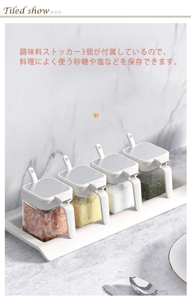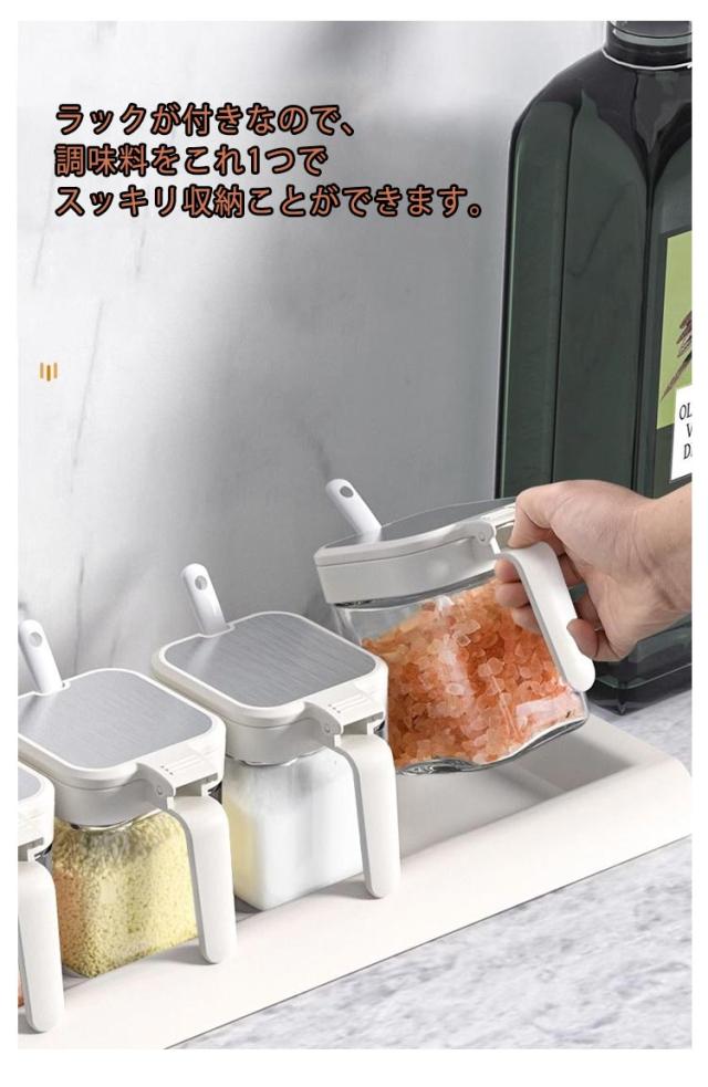 | 新生活を始められる方にもお薦めのお洒落な調味料入れセットです。 調味料ストッカー3個が付属しているので、料理によく使う砂糖や塩などを保存できます。 ラックが付きなので、調味料をこれ1つでスッキリ収納ことができます。 ぎゅっと閉まっていても、ワンタッチで簡単オープン、密閉性と操作性を兼ね備えた。 しっかり閉まって湿気・乾燥を防ぎ、調味料の鮮度を保ちます。 専用のスプーンもついて、容器の中に入れられます。 | |