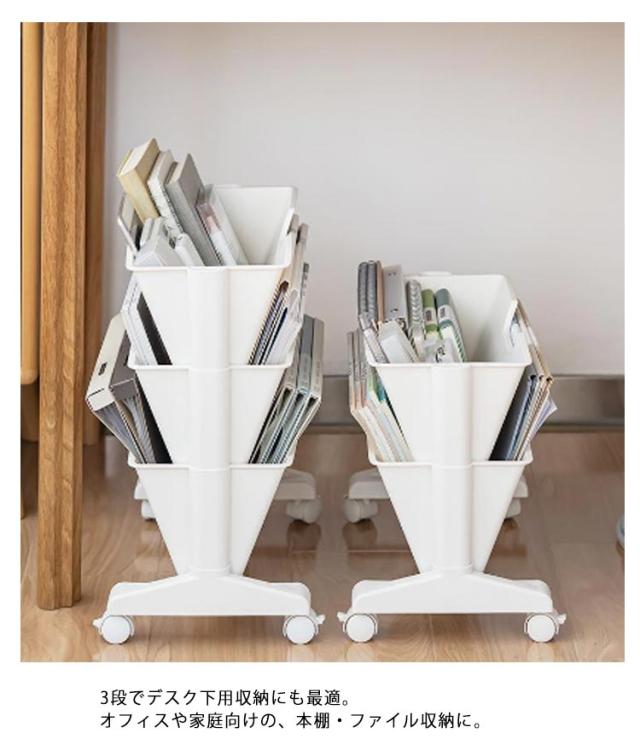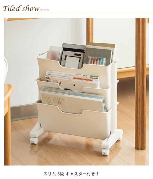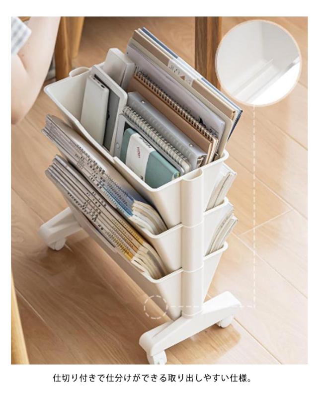 | 本や書類、雑誌も小物も綺麗に 収納ワゴン スリム 3段 キャスター付き! 仕切り付きで仕分けができる取り出しやすい仕様。 3段でデスク下用収納にも最適。オフィスや家庭向けの、本棚・ファイル収納に。 移動に便利なキャスター付きなので、掃除や物を取り出す際にも楽に動かすことができます。 デスク周りに置いておきたい参考書籍を収納し、デスクで作業をしながら使いたいときに便利です。 | |