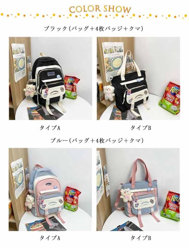 | サイズについての説明 | サイズ:タイプA(31*15*44cm) タイプB(30*11*30cm) 色: ブルー(バッグ+4枚バッジ+クマ) ピンク(バッグ+4枚バッジ+クマ) ブラック(バッグ+4枚バッジ+クマ) パープル(バッグ+4枚バッジ+クマ)※素人採寸ですので、1-3mm程度の誤差がある場合がございます。 |