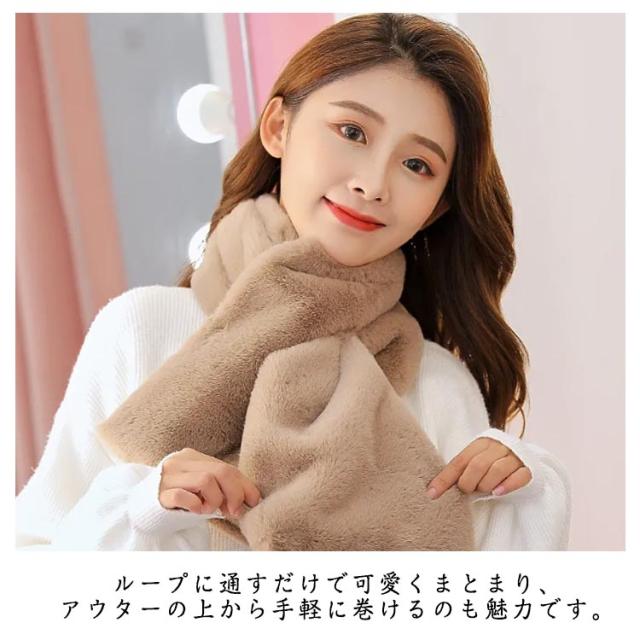 | ふわふわの手触りと優しい温もりが楽しめるフェイクファーマフラー。 防寒としてはもちろん、シーズンファッションのキーアイテムとしてもオシャレな存在感を発揮します。 毛足が短いのでチクチクもしにくい。 ループに通すだけで可愛くまとまり、アウターの上から手軽に巻けるのも魅力です。 | |
