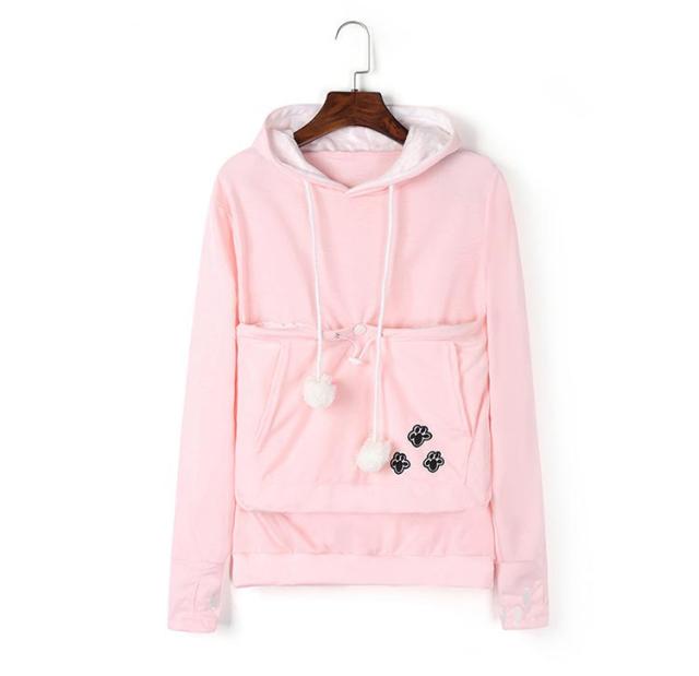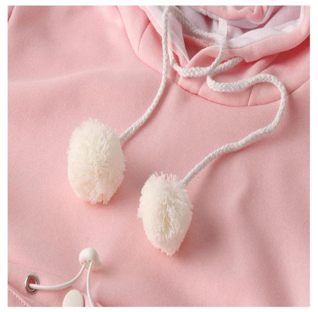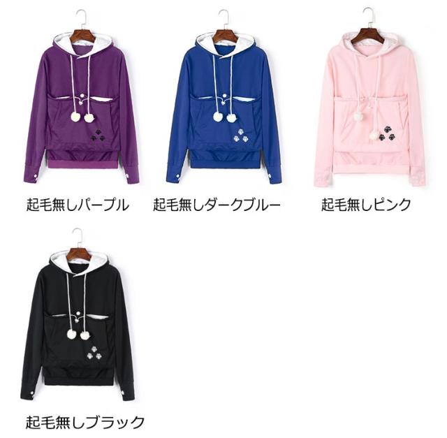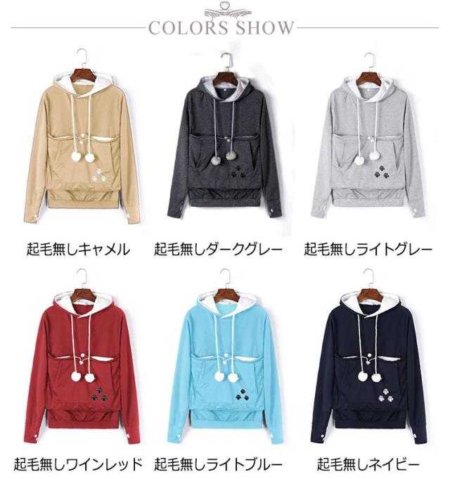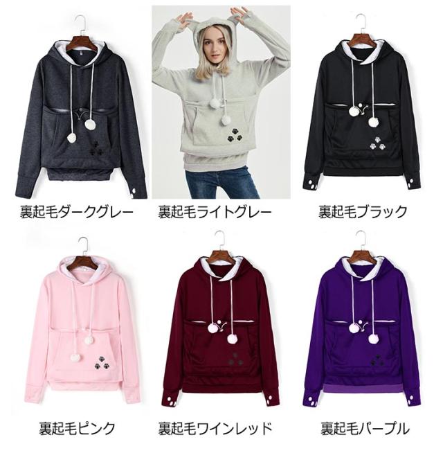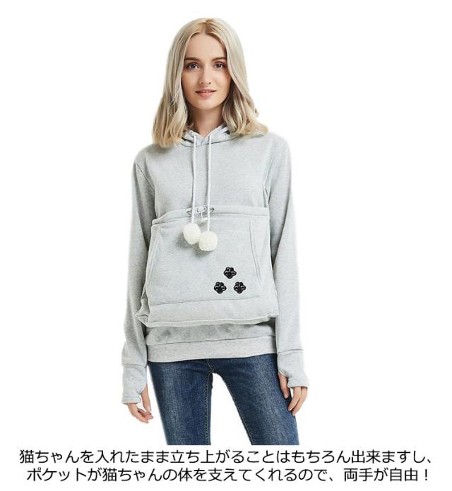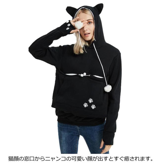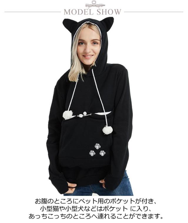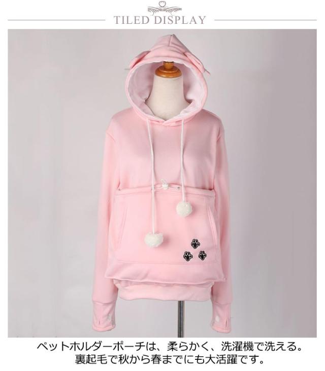 | 猫や犬や他の小動物の抱っこ用パーカーです。 お腹のところにペット用のポケットが付き、小型猫や小型犬などはポケット に入り、あっちこっちのところへ連れることができます。 猫顔の窓口からニャンコの可愛い顔が出すとすぐ癒されます。 入れたまま移動出来るので抱っこ紐やスリング代わりとしても。 猫ちゃんを入れたまま立ち上がることはもちろん出来ますし、ポケットが猫ちゃんの体を支えてくれるので、両手が自由! ペットホルダーポーチは、柔らかく、洗濯機で洗える。裏起毛で秋から春までにも大活躍です。 | |