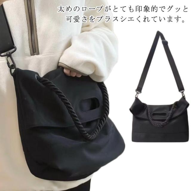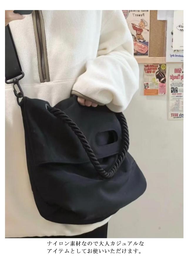 | 太めのロープがとても印象的でグッと可愛さをプラスシエくれています。 ナイロン素材なので大人カジュアルなアイテムとしてお使いいただけます。 カジュアルなデイリーユースから、旅行や外出先での使用まで幅広いシーンで活躍します。 傘、ipad、書籍など必要なものは入ります。 | |