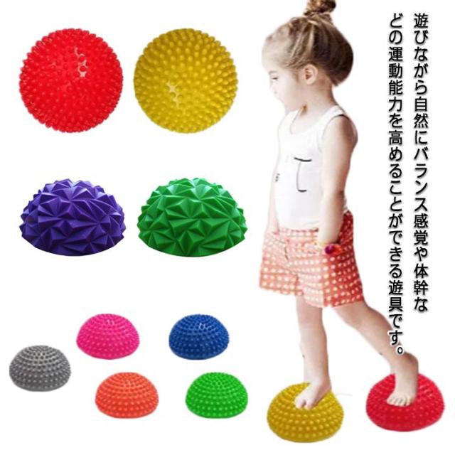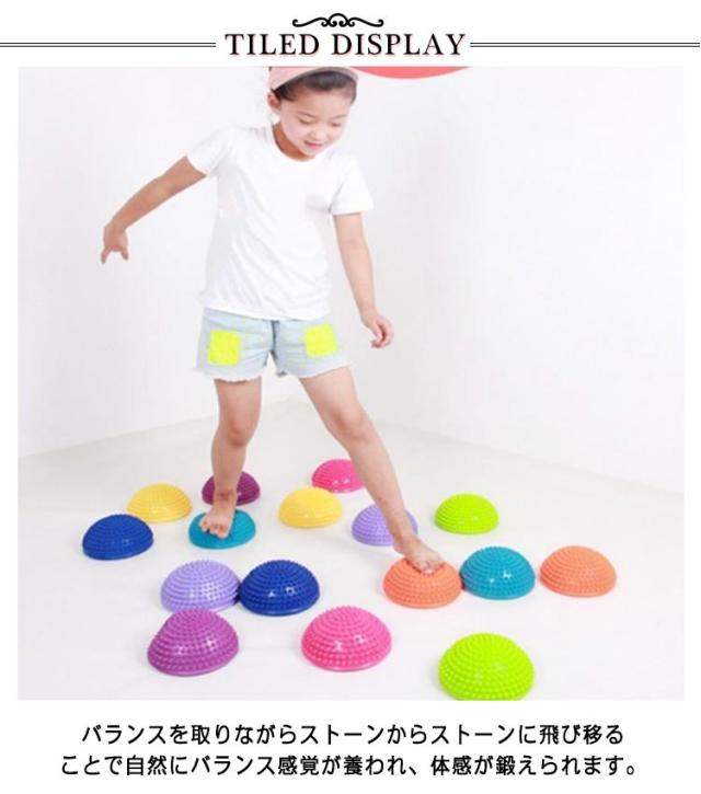 | 遊びながら自然にバランス感覚や体幹などの運動能力を高めることができる遊具です。 バランスを取りながらストーンからストーンに飛び移ることで自然にバランス感覚が養われ、体感が鍛えられます。 ジャンプしながらストーンを移動することで、足の裏が刺激され、足裏の筋肉が柔軟になります。 運動能力をアップさせるには、足裏を日常的に刺激して感覚を鋭くすることが重要です。 幼少期から足裏や足の指を刺激し、感覚を鍛えることは、運動能力向上においてとても大切なことなのです。 歩いて渡るだけでなく、ジャンプしたり、カラーを活用し指定した色に飛び移るなど、どうやって遊ぶかをお子さま自身で考えることができます。 ご家庭での遊びを兼ねたトレーニングはもちろん、幼稚園や保育園、児童館、学童保育、小学校、幼児体育教室など、様々なシーンでご活用いただけます。 | |
