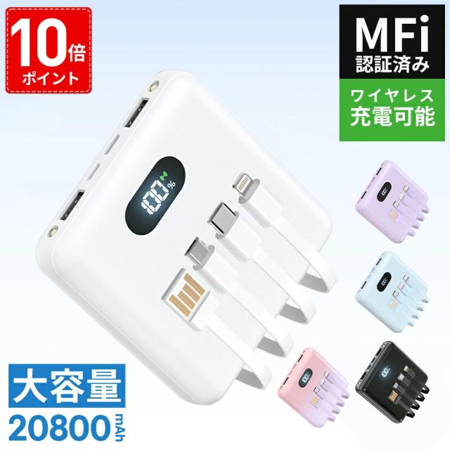 【6台同時充電&4ケーブル内蔵】モバイルバッテリー 大容量 20800mAh 4本ケーブル内蔵 超軽量 小型 ワイヤレス充電 6台同時充電 3way蓄電 MFi認証 持ち運び便利 LEDライト 残量表示 「2024新登場」iPhone/iPad/Android対応 電熱ベスト/電気毛布用 地震 停電 対策