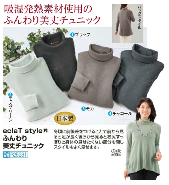 ハイネック チュニック カットソー レディース 日本製 eclaT style(R) ふんわり美丈チュニック 全4色 婦人服 ミセス シニア 女性 ブラック グリーン ブラウン グレー 無地 シンプル 吸湿発熱 体型カバー 50代 60代 70代 80代 母の日 お母さん 秋物 冬物 秋冬 dz p25231