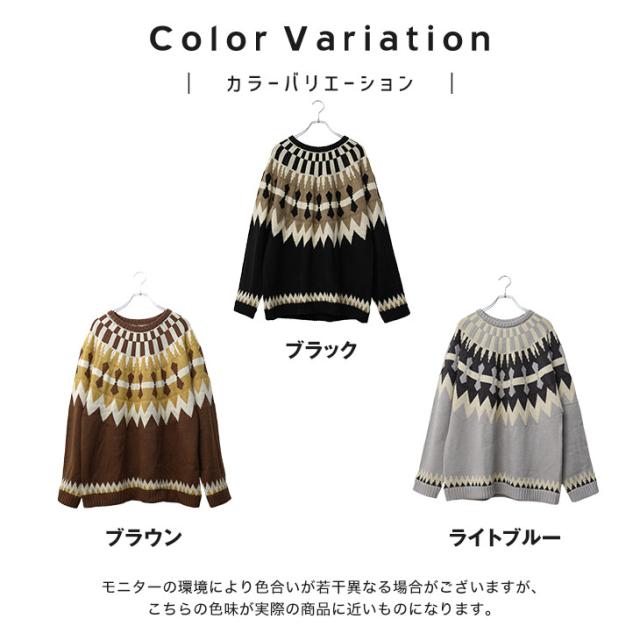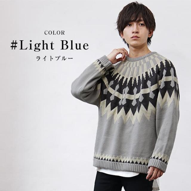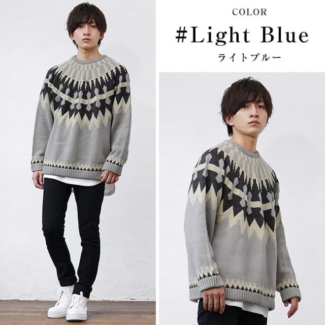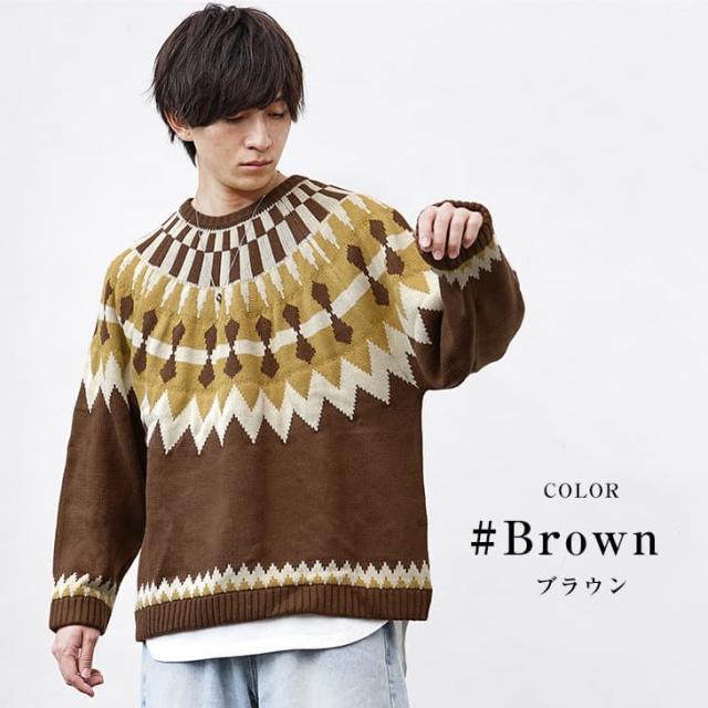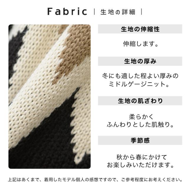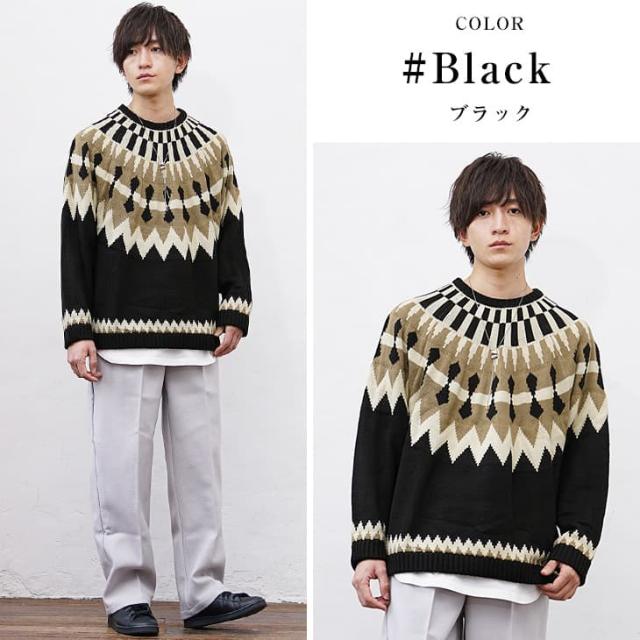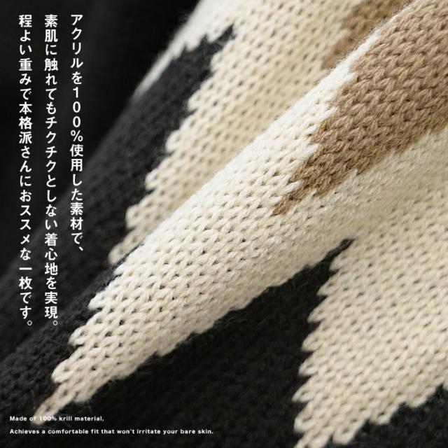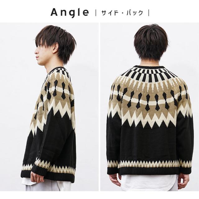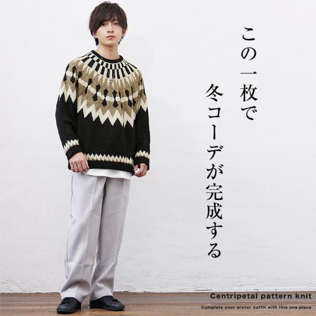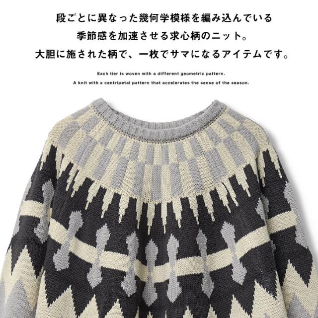 段ごとに異なった幾何学模様を編み込み季節感を加速させる求心柄のニット。