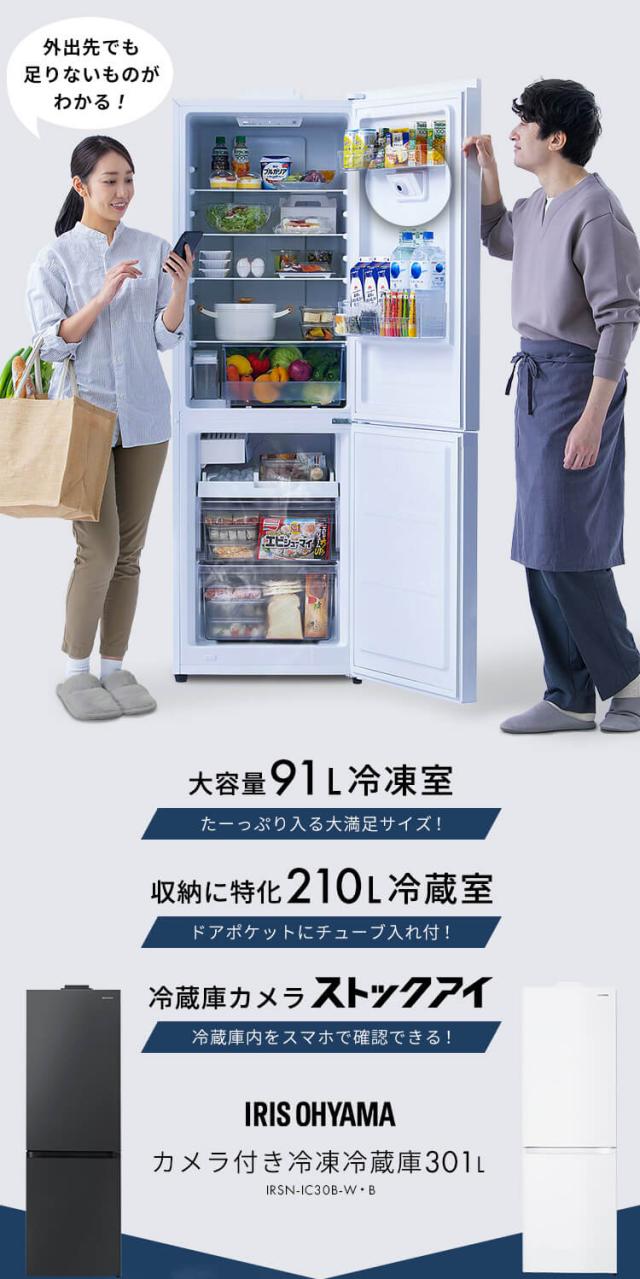冷蔵庫 一人暮らし 2ドア アイリスオーヤマ * ストックアイ STOCK EYE IRSN-IC30B 301l 大型 大容量 家庭用 スリム 薄型 庫内 カメラ搭載 冷凍庫 急冷 自動製氷 右開き ファン式 自動霜取り 霜取り不要 省エネ 家族 二人暮らし 冷凍冷蔵庫 300l