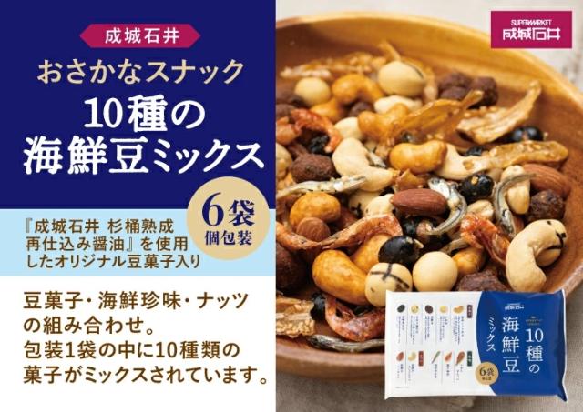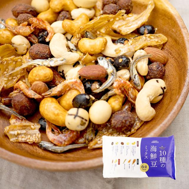 5種の豆菓子・3種の珍味・2種のナッツの合計10種がミックスされています。杉桶熟成再仕込み醤油を使用したオリジナルの豆菓子入りです。