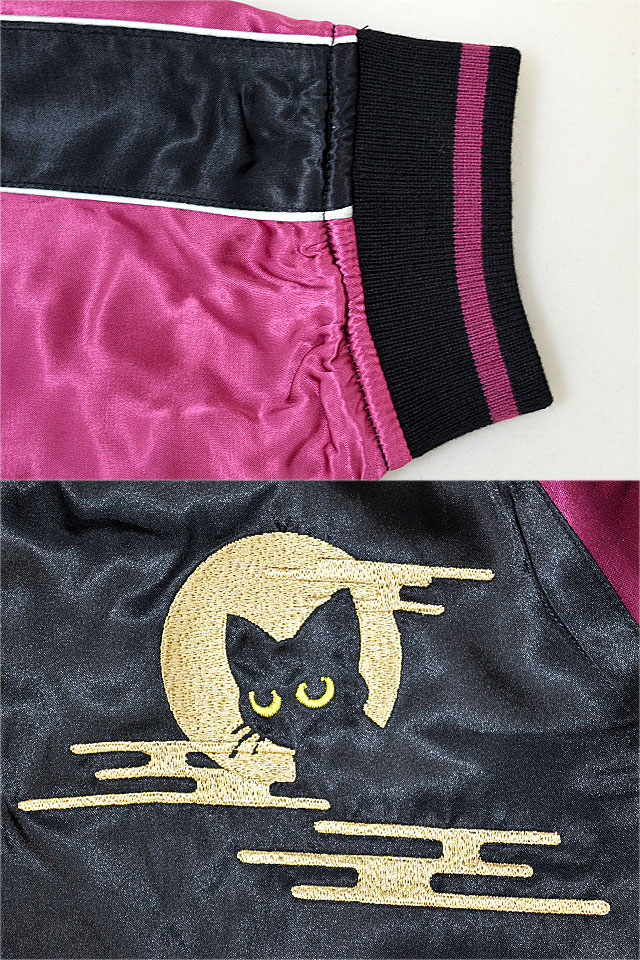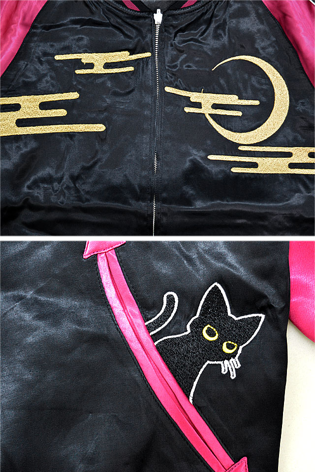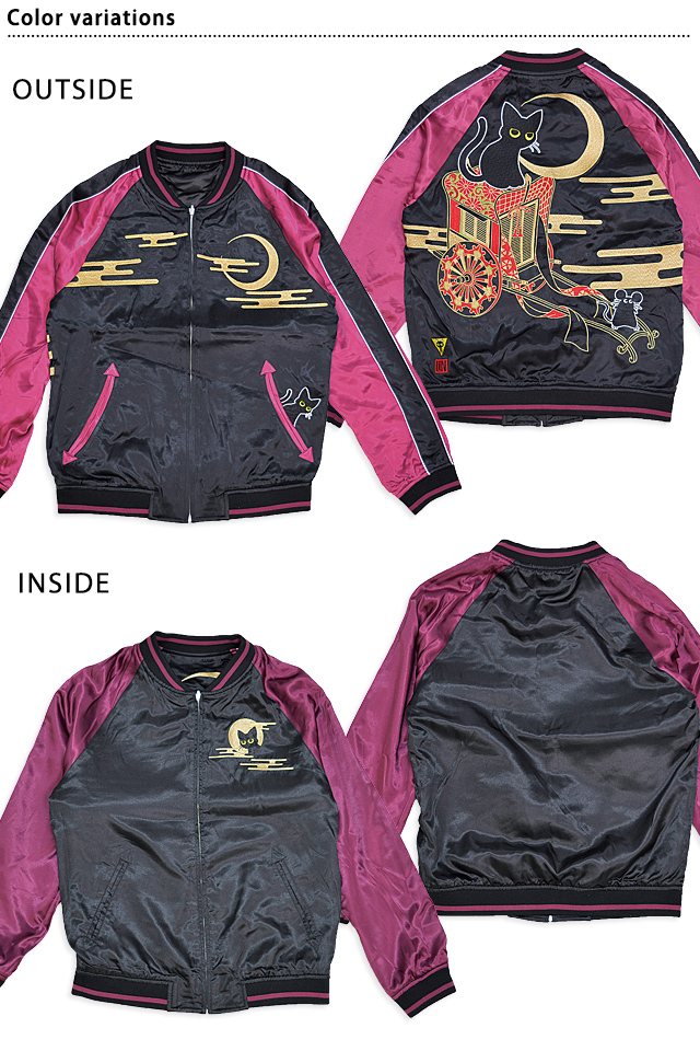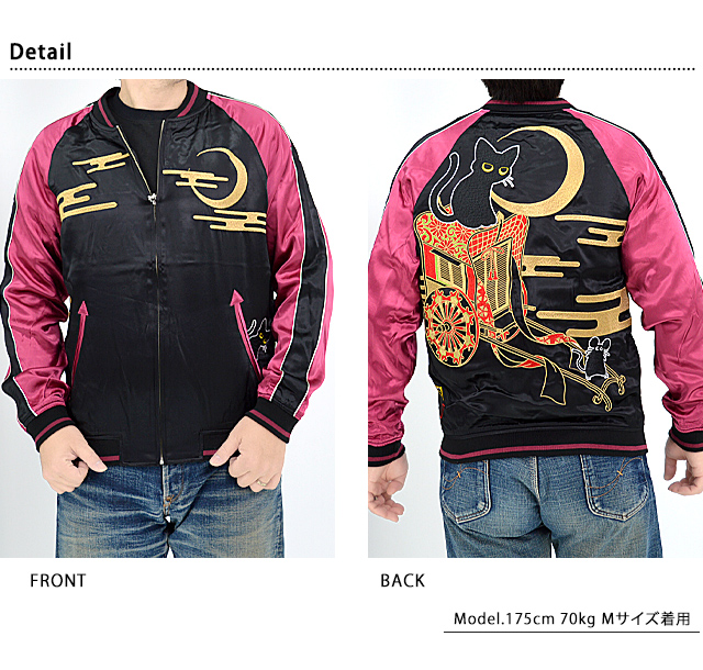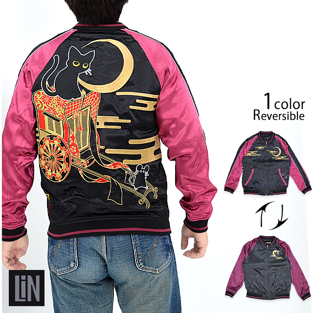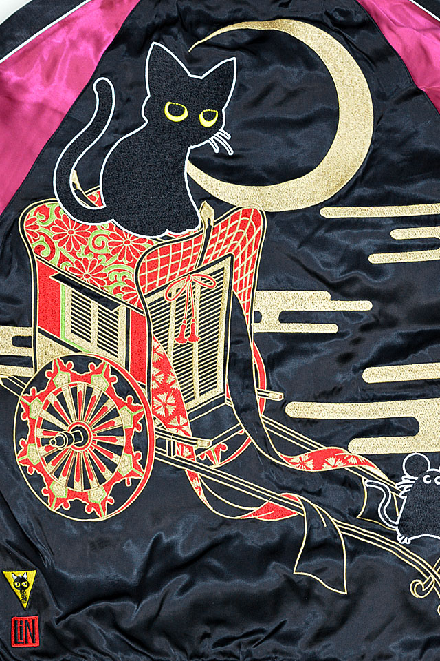何でもあり、何でもやる新ブランド「LIN」から「ラミ&アール 花車スカジャン(AL-75607)」のご紹介です。 黒猫のLamy(ラミ)とネズミのEarl(アール)。 今回は花車を組み合わせた、上品で高貴なデザイン。 フロント左ポケットからはラミが顔を覗かせています。 表面とは対象的に、裏面はシンプルに仕上げ、メリハリを付けました。 ボディーにはレーヨンサテンを使用し、ドレープや陰影がくっきりと現れています。 | ||||||||||||||||||||