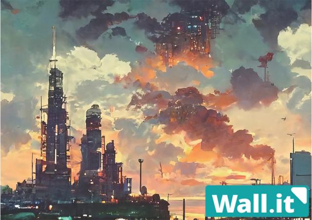 【Wall.it A4 フィギュアディスプレイケース専用背面デザインシート 横向】 工場 風景 コンビナート 夕日 夕焼け 海辺 海浜