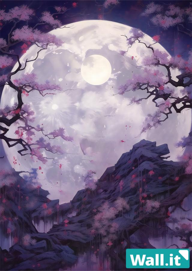 【Wall.it A4 フィギュアディスプレイケース専用背面デザインシート 縦向】 紫 満月 月光 和風 中華風 クレーター 月夜 岩場 松 水墨画風 夜景