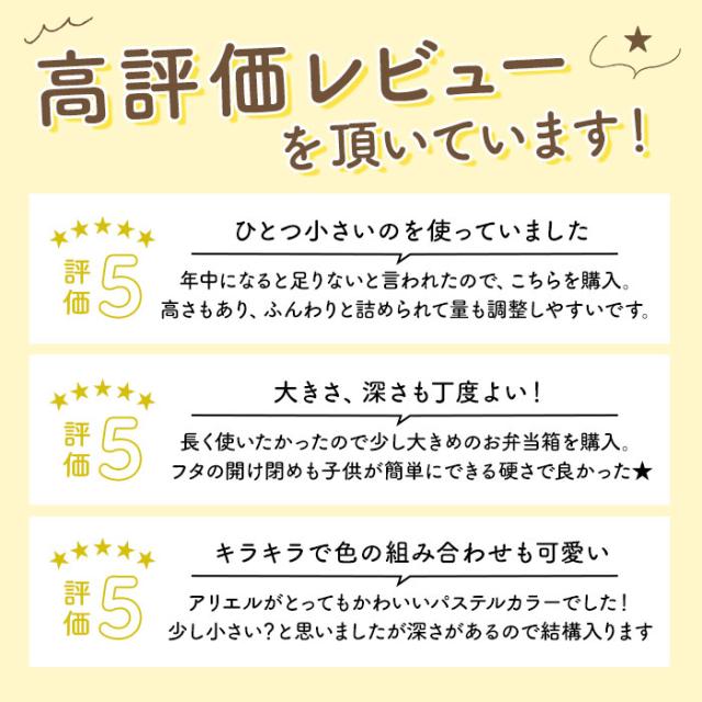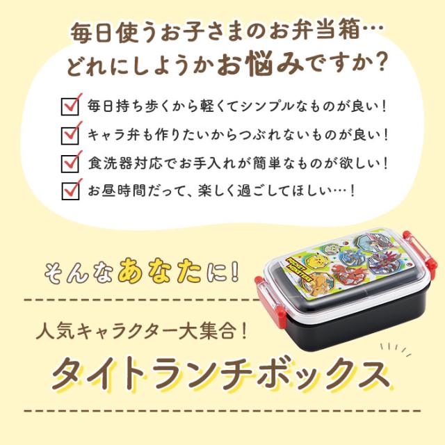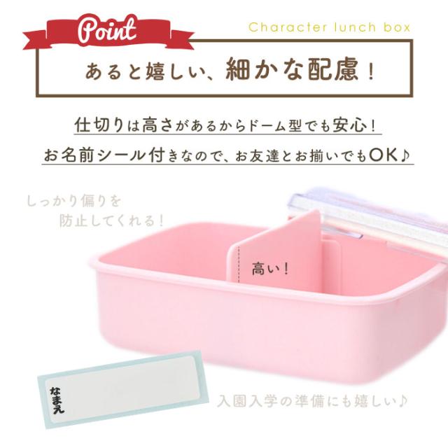 | 商品説明 | ・ふんわり盛り付けできるドーム型のフタがポイント♪お弁当が可愛く”映える”キャラクターデザインのランチボックス。 【ふわっと盛っておいしさアップ★】 ・ドーム型のフタは、のりやふりかけがフタにつきにくい!押し潰れを防いで見た目もきれい♪ 【しっかり密閉して汁漏れをガード】 ・2点ロック式&フタ裏にはパッキン付き。汁漏れしにくく持ち運び時も安心。 【お子さまにぴったりなサイズ感】 ・片手で持ちやすく、屋外でのお食事にも便利な1段式。容量は約450ml、お弁当箱1/2に入るご飯の量は、お茶わん約1.1杯分。(※お茶わん1杯分を約200mlとして算出) 【キレイな盛り付けをキープ】 ・おかずが片寄りにくい高い仕切り付き。お好みの位置に微調整可能。 【熱々ごはんを味わえる♪】 ・フタを外して電子レンジでの温めOK。温め直せば、いつでもあったかごはんを楽しめちゃう! 【お手入れがラクチン】 ・うれしい食洗機対応。お手入れしやすく、忙しいママも笑顔に☆ 【抗菌仕様で衛生的】 ・抗菌効果のある銀イオンを練りこんだ素材を使用。いつも清潔をキープ。(※抗菌加工を施しておりますが、すべての細菌の増殖を抑制するものではありません。) 【ネームシールが付属】 ・名前を記入できるから、お友達とお揃いでも大丈夫。 【お気に入りをチョイス】 ・みんな大好きなキャラクターが大集合!お気に入りのキャラクターと一緒なら、ランチタイムがもっと楽しくなること間違いなし◎安心の日本製。 |