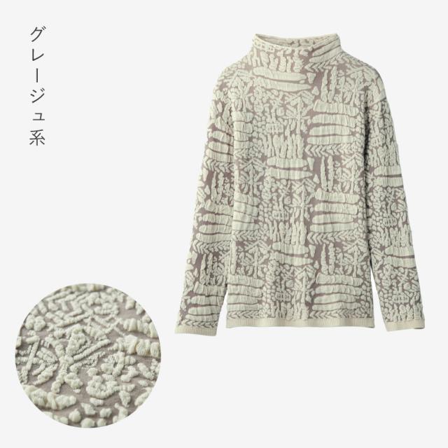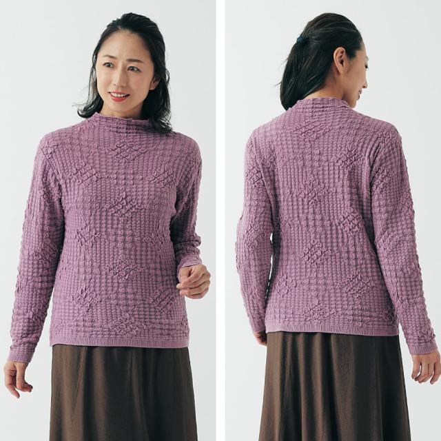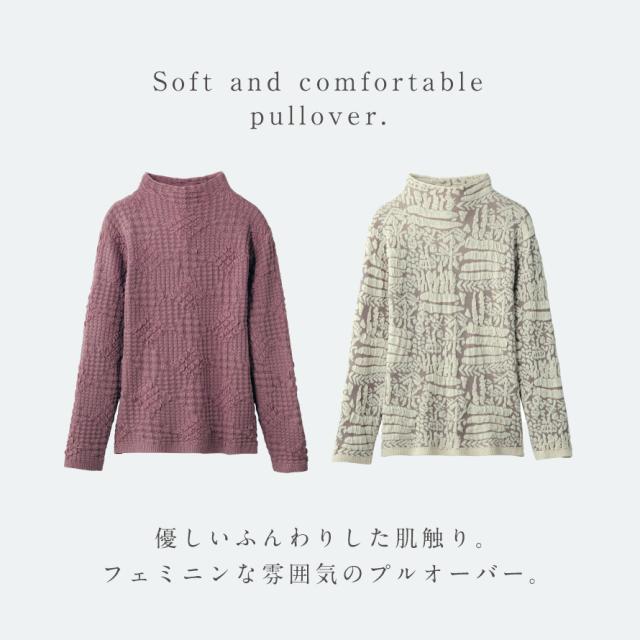 ふんわり優しい肌触り、伸縮性に優れたプルオーバー。ふくれジャガード編みで空気の層ができるので暖かく、ふっくら優しい着心地。厚みがあるのに軽くて柔らか。