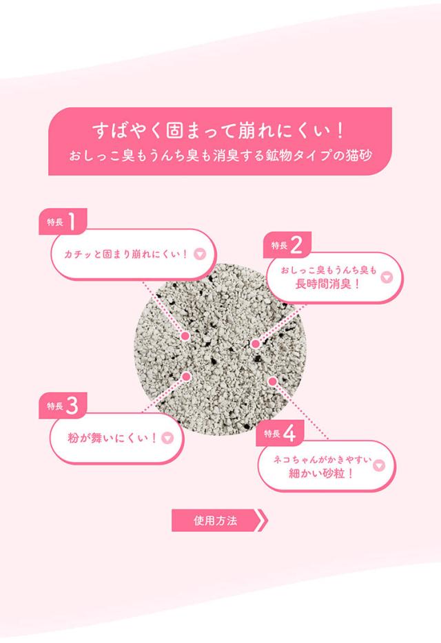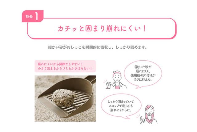 細かい砂粒がネコちゃんのおしっこをスピード吸収して、すぐに固まる!お掃除ラクラクで、かんたんにトイレが清潔に。