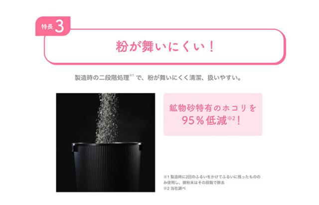 ・本品は厳重な品質管理のもとで極力、粉が発生しないよう製造されていますが、廃棄や補充のときは換気をよくして微粉末を吸い込まないようにお気を付けください。特にぜん息気味の方や気管支の弱い方、アレルギー体質の方はご注意ください。万が一、微粉末を吸い込んだ場合は、医師や獣医師にご相談ください。