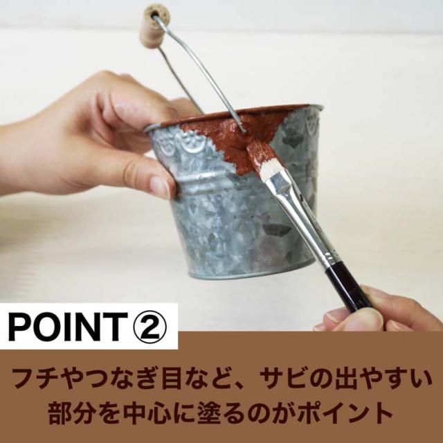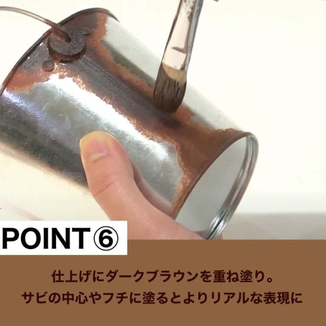 簡単・リアルに錆仕上げができる水性塗料です。缶やブリキバケツなど、金属雑貨の錆を表現することで、アンティークな雰囲気やジャンクな雰囲気が簡単に作れます。ミルクペイントと組み合わせることで、よりお洒落な雑貨に仕上がります。ダークブラウンでこげ茶の錆、レッドブラウンで赤茶の錆を表現できます。