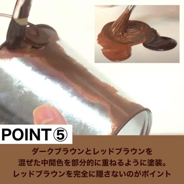 | ・色:ダークブラウン・レッドブラウン ・塗れるもの:木部・紙・硬質塩ビ・金属・モルタル ・塗れないもの:PP、PE等・一部プラスチック・塩ビクロス等柔らかい素材 ・水性 ・容量:各100mL ・用途:錆風塗料 |