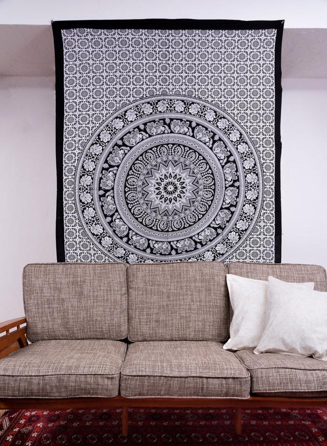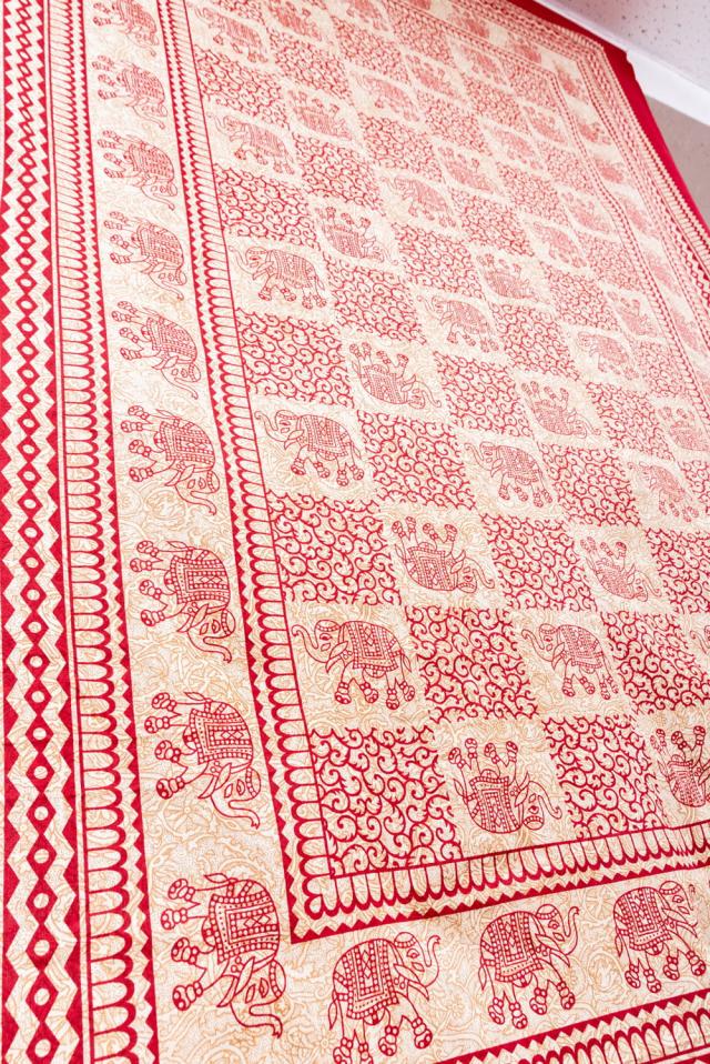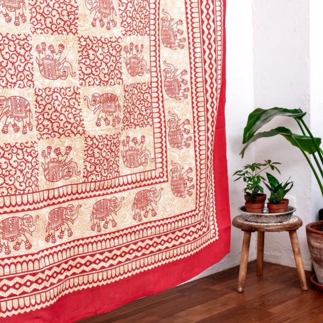 大きな布にとても丁寧に、インド伝統の唐草柄やマンダラ柄、象さんや、お花などがプリントされているので、こちら1枚をお部屋に飾るだけでアジアンなお部屋に大変身!